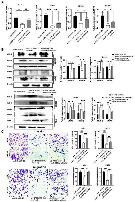 MiR-145-5p reversed lncRNA RP11-297P16.4-induced MMP-2/9 expression in NSCLC cells. (A) MMP-2/9 levels were detected by RT-qPCR after A549 and H1299 cells were co-transfected with sh-RP11-297P16.4 or the miR-145-5p inhibitor. (B) MMP-2/9 levels were detected by Western blot analysis following cotransfection with sh-RP11-297P16.4 and the miR-145-5p inhibitor or the RP11-297P16.4 plasmid (OE-RP11-297P16.4) and the miR-145-5p mimic into these cells. (C) Transwell assays were performed to assess NSCLC cell migration ability following treatment with sh-RP11-297P16.4 and the miR-145-5p inhibitor. Data are presented as mean ± SD; * p < 0.05, ** p < 0.01, and *** p < 0.001.