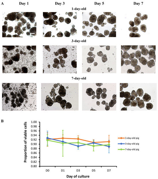 On light microscopy, islets from 1-, 3-, and 7-day-old neonatal pigs were similar in gross morphology at 1, 3, 5, and 7 days of culture. The number of contaminating acinar cells detected on the day of isolation (Day 0) and Day 1 decreased to a point where they were minimal and barely visible in all cultures by Day 3 to Day 7 (Figure 1A). The formation of the peri-islet capsule, forming the “micro-organ” structure or islet cluster that has been previously discussed, was visualized starting at Day 3 [29,30,31] (Figure 1A). All islets obtained from 1-, 3-, and 7-day-old neonatal pigs had comparable viability while in culture, with no significant differences between the groups at Day 7 of culture (Figure 1B).