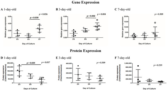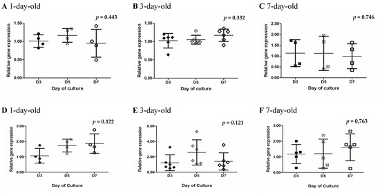 RAC1 gene expression levels in islets obtained from 1-, 3-, and 7-day-old neonatal pigs were comparable across Day 3, Day 5, and Day 7 of culture with no statistically significant differences being detected among the groups (Figure 3A–C, Table S8). The insulin gene expression levels in islets obtained from different ages of neonatal pigs showed variable fluctuations and were not statistically different among the groups compared (Figure 3D–E, Table S9).