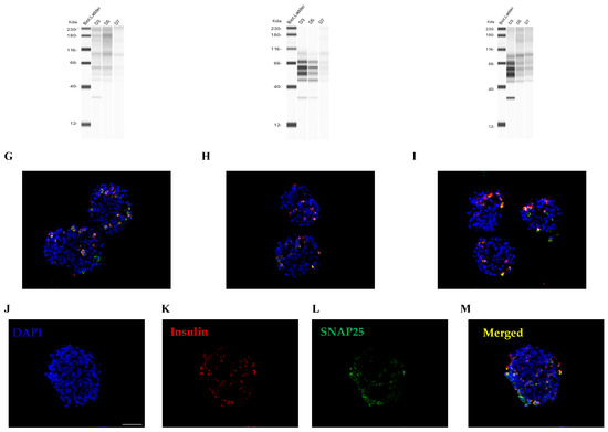 SNAP25 gene expression in islets from 1-, 3-, and 7-day-old neonatal pigs appeared to increase from Day 3 to Day 7 of culture (Figure 4B,C, Table S10). This increasing trend was found to be statistically significant in islets from 1- and 3-day-old pigs (p = 0.026 and p = 0.004, respectively, as determined by the Kruskal–Wallis test; Figure 4A,B, Table S10). A similar trend was observed in islets from 7-day-old pigs, but this was not found to be statistically significant (Figure 4C, Table S10). Further analysis revealed statistically significant differences in the expression of SNAP25 gene in islets from 1-day-old pigs cultured for 5 and 7 days (p = 0.028 as determined by Dunn’s multiple comparisons test, Figure 4A, Table S10) and islets from 3-day-old pigs cultured for 5 and 7 days (p = 0.002 as determined by Dunn’s multiple comparisons test, Figure 4B, Table S10). For SNAP25 protein expression, a decreasing trend was apparent across all ages of pigs (Figure 4D–F, Table S11). This decreasing trend in SNAP25 protein expression reached significance in islets from 1-day-old pigs (p = 0.017 as determined by the Kruskal–Wallis test), particularly between islets cultured for 1 and 7 days (p = 0.029 as determined by Dunn’s multiple comparisons test). Immunostaining of islets revealed co-localization of SNAP25 and insulin in most of the beta cells (Figure 4G–M).