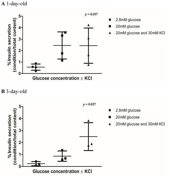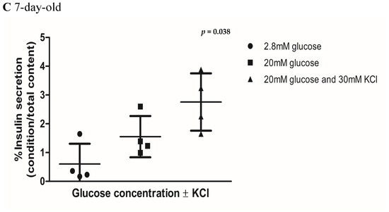 In vitro insulin secretory capacities of islets from 1-, 3-, and 7-day-old neonatal pigs at Day 7 of culture. (A) Islets from 1-day-old pigs (n = 4, p = 0.037, black circles), (B) 3-day-old pigs (n = 3, p = 0.027, black squares), and (C) 7-day-old pigs (n = 4, p = 0.038, black triangles). In total, 200 islet equivalents for each group were exposed to 2.8 mM of glucose to quantify basal insulin secretion and later exposed to 20 mM of glucose and 20 mM of glucose plus 30 mM of KCl conditions to quantify stimulated insulin secretion. Error bars indicate standard deviations. The p values were determined by the Kruskal–Wallis’s test.