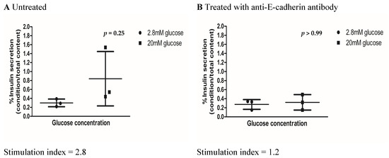 To demonstrate the importance of E-cadherin and cell–cell adhesion in maintaining the function of neonatal pig islets, we treated islets from 3-day-old pigs with anti-E-cadherin monoclonal antibody, subsequently testing their insulin secretory capacity in vitro. Following treatment with the anti-E-cadherin antibody, islets were not able to increase the proportion of insulin that they secreted under high-glucose conditions (Figure 6B, Table S13), demonstrating a stimulation index of 1.2-fold compared with the 2.8-fold increase seen in the untreated control group (Figure 6A,B, Table S13). In addition, following treatment with the anti-E-cadherin monoclonal antibody, islets showed qualitative changes, having a less well-defined peri-islet capsule (Figure 6D) compared with untreated islets (Figure 6C).