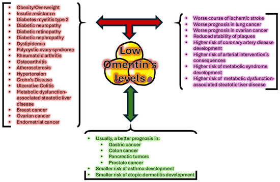 Current knowledge points out many simple correlations between plasma omentin concentrations and the course of diseases. Most of the time, high omentin levels are associated with a better health state in comparison to individuals with low levels. Examples of this tendency are obesity itself [14,32,33], T2DM [32,36], atherosclerosis [10,47], OA [72], PCOS [23,136,137], CD [7,68,133], UC [134], MASLD [118], OC [90,91], endometrial cancer [78,91,94,95], breast cancer [78,85,86,87,88], and lung cancer [54]. However, this general principle is not absolute and has some exceptions. Higher omentin concentrations can be associated with gastrointestinal tumors [78,79,80,81,82,83,84], prostate cancer [78,96,97], advancement of clinical stage of gastric, colon, and pancreatic tumors [93], as well as severity of some inflammatory diseases like asthma [106] or systemic sclerosis [150]. A lot of these conditions have unknown origins, and an analysis of omentin’s role in them could potentially help with filling these gaps. When it comes to tumors, the function of adipokines still needs to be further investigated, as their meaning could potentially extend their usage as a biomarker.