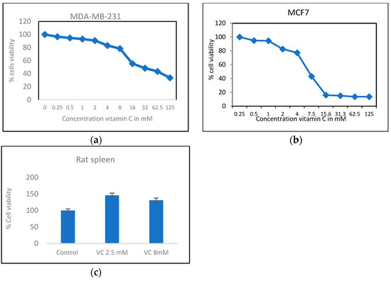 (a) MTT result of cell viability MDA-MB-231 cells treated with VC from 0 to 125 mM. (b) shows MCF7 cells treated with VC from 0 to 125 mM. (c) shows that rat spleen had higher % cell viability with treatment of VC at 2.5 mM and 8 mM showing non-cytotoxic effect of VC on normal cells.