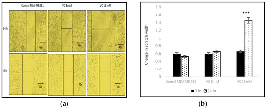 To evaluate if VC affects cellular migration, MDA-MB-231 cells were cultured at a density of 1 × 105 cells in a 12-well dish for 24 h. Subsequently, a scratch was created using a sterile pipette tip, and the area of migration was captured using an inverted microscope (40×). The width of the scratch was quantitatively analyzed at 0 and 24 h post-scratch, following established methodologies [14,15]. Besides MDA-MB-231, the assay was also performed on MCF7, HEK 293, and CCL 205 cell lines.