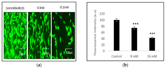 The depletion of mitochondrial membrane potential due to cell death was evident through the generation of reactive oxygen species (ROS) in MDA-MB-231 cells treated with VC, as detected by Rhodamine 123 staining. Control cells displayed higher fluorescence intensity, indicating a healthier membrane potential compared to treated cells. This depletion was most pronounced in cells treated with 16 mM VC (Figure 5a,b).