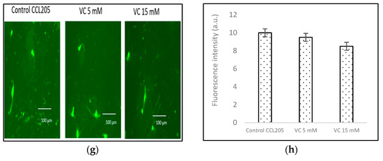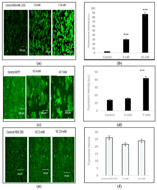 Intracellular ROS generation was assessed using the H2DCFDA staining method. Control MDA-MB-231 cells exhibited lower ROS levels, as indicated by a darker green fluorescence, compared to MDA-MB-231 cells treated with 8 mM or 16 mM VC. The higher the concentration of VC, the greater the intracellular ROS generation, characterized by a brighter green fluorescence (Figure 6a). Figure 6b presents a histogram comparing ROS levels in treated cells versus the control. To further evaluate the effects of VC on different cell lines, MCF cells, along with non-cancerous HEK 293 kidney cells and CCL 205 lung cells, were also tested (Figure 6c–h).