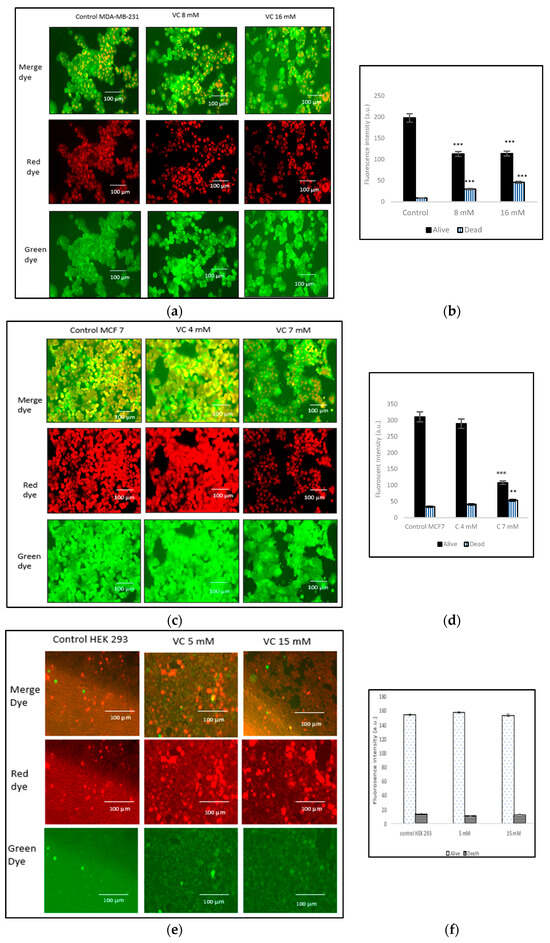 To assess whether the deoxynucleic acid (DNA) of MDA-MB-231 cells was altered following VC treatment, a nuclear-ID red/green cell viability assay was performed according to the manufacturer’s protocol (Enzo Life Sciences Inc, Farmingdale, NY, USA), as previously described [14]. The simultaneous use of red and green dyes allows for the determination of live and dead cells, which were captured using Floid cell imaging with a scale bar of 100 µm. A histogram was prepared to compare the quantities of live and dead cells using Image J software. Besides MDA-MB-231, assay was also performed on MCF7, HEK 293, and CCL 205 cells.