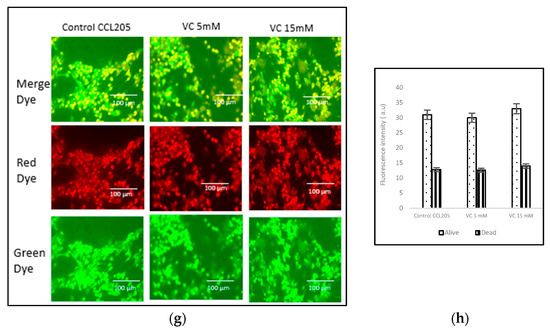The viability of cells treated with two different concentrations of VC was assessed using the nuclear-ID red/green cell staining method. Live cells were stained green, as the dye penetrated the cytoplasm of intact cell membranes, while dying or dead cells, with compromised membranes, were stained red. In the control group of MDA-MB-231, cells displayed a red or orange color when the red and green dye images were merged, indicating non-viable cells. The treatment of MD-MBA-231 with 16 mM VC led to the highest number of cell deaths, as evidenced by more orange color observed after merging the red and green dyes (Figure 7a). Figure 7b presents a histogram showing cells dead versus live cells in MDA-MB-231, analyzed using ImageJ software. To further evaluate VC’s effects on various cell lines, MCF7 cells, along with non-cancerous HEK 293 kidney cells and CCL 205 lung cells, were also tested (Figure 7c–h).