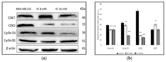 Cancer proliferation is often associated with altered cell cycle regulation; hence, targeting cell cycle proteins offers promising cancer chemotherapy strategies [22]. Distinct cell cycle phases (G0/G1, S, G2, and M) are regulated by specific cyclin-dependent kinases (CDKs) [23]. This study showed that significant downregulation of cyclin B1, cyclin D1, and CDK2 expression strongly suggests that VC effectively inhibits MDA-MB-231 cells at different cell cycle phases. There was a slight increase in CDK7 expression (p < 0.01) between the control and 8 mM VC treatment; however, no significant change was observed at the higher VC dose of 16 mM, indicating that CDK7 is not affected by VC.