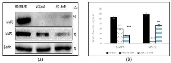 To determine if VC caused the inhibition of cell migration and invasion associated with matrix metalloproteinases (MMP)-2 and -9, proteins that are involved in angiogenesis, Western blot analysis was performed in MDA-MB-231 (Figure 9a). The band intensity histogram in Figure 9b shows the expression of MMP2 and MMP9 compared to the control.
