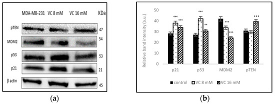 To determine if VC regulated the cellular pathway involved in DNA repair, cell cycle, apoptosis, and angiogenesis, the interaction between p53 tumor suppressor protein and oncogene mouse double minute 2 homolog (MDM2) was studied using Western blot analysis. p21 gene codes for cyclin-dependent kinase inhibitor were upregulated along with p53 (Figure 10a). The band intensity histogram in Figure 10b shows the expressions of p53, p21, MDM2, and the phosphatase and tensin homologs deleted on chromosome ten (pTEN).