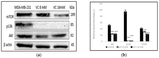 (a) Western blot analysis of p13k, Akt, and mTOR proteins. (b) Histogram represents the downregulation of p13k, Akt, and mTOR proteins from cells treated with VC as compared to the control. Significant change in protein expressions *** p< 0.001, post hoc Newman–Keuls test.