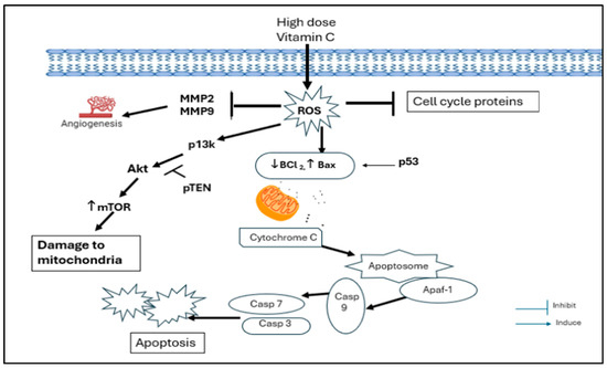 In the present study, a pharmacological dose of VC showed convincing evidence of killing MDA-MB-231, a TNBC model. At concentrations of 8 mM and 16 mM, VC killed approximately 20% and 50% (IC50) of the cancer cells, respectively. Decreased cell viability, increased ROS formation, elevated levels of pro-apoptotic caspases -7, -8, and -9, the decreased expression of cell cycle regulatory proteins CDK2, cyclin B1, and cyclin D1, the reduced expression of MMP2 and MMP9, the increased expression of tumor suppressor genes such as p21, p53, and PTEN, and the decreased expressions of MDM2, p13k, Akt, and mTOR were observed to confirm the effect of a pharmacological dose of VC on TNBC, as presented in Figure 12.