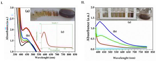 (I). (a) Color change in the solution from brownish-red to a dark brown due to silver bioreduction by Melissa officinalis extract; (b) UV–Vis spectra of ME AgNPs samples obtained by reduction in time with Melissa officinalis extract; (c) UV–Vis spectra of 0.5 mM AgNO3 aqueous solution; (II). (a) Color change in the solution from brownish-red to a dark brown due to silver bioreduction by Clematis vitalba extract; (b) UV–Vis spectra of CVE AgNPs samples obtained by reduction in time with Clematis vitalba extract. ME AgNPs: Melissae extractum silver nanoparticles; CVE AgNPs: Clematis vitalbae extractum silver nanoparticles.