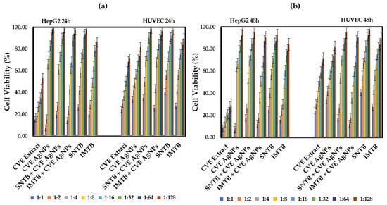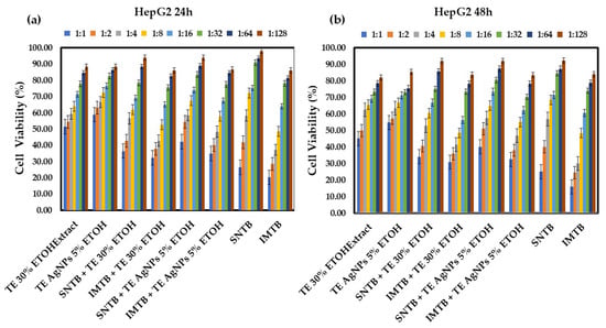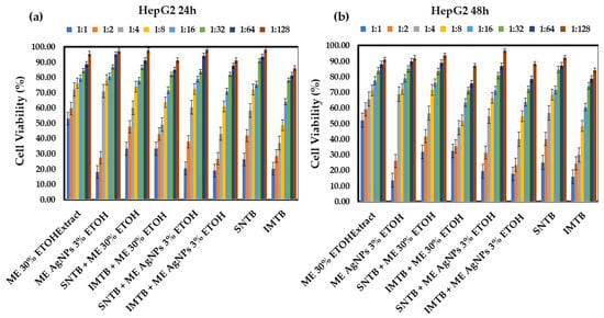Cell viability (%) of HepG2 lines after: (a) 24 h of treatment with various dilutions of Melissae extractum-based samples and the chemotherapeutic drugs sunitinib and imatinib; (b) 48 h of treatment with various dilutions of Melissae extractum-based samples and the chemotherapeutic drugs sunitinib and imatinib. Error bars represent standard deviation (n = 3). The abbreviations are explained in Table 2 and Table 4. Different colors represent various dilution ratios (v:v) for each sample with deionized water.