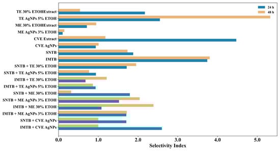 The treatments outlined in this study aim to utilize silver nanoparticles derived from Melissa officinalis, which have also been shown to play a significant role in inhibiting tumor cell proliferation, exhibiting a more potent effect than the extract alone. The combination of the alcoholic extract and biogenic silver nanoparticles obtained from Melissa officinalis (ME AgNPs) may enhance treatment efficacy and could be as effective, or even more effective, with minimal toxic effects on normal cells. Thus, the cytotoxic effect of the extracts derived from Melissa officinalis was evaluated after 24 h and 48 h post-treatment. Figure 4a,b present measurements of cell viability after 24 h and, respectively, 48 h of treatment with the extracts derived from Melissa officinalis compared to the drugs administered alone.