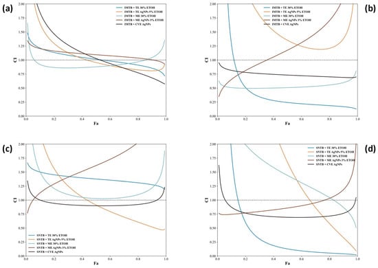 Two control groups were used for the reference antitumor action, consisting of Sunitinib (SNTB) and imatinib (IMTB). The control samples were prepared following the same preparation conditions for successive dilutions from 1:1 to 1:128 as those for test samples. Compared to the anticancer action of these two synthetic drugs used in clinical practice, all the cytotoxic results obtained for each plant extract, plant extract–nanoparticle combination, or plant extract ± nanoparticle–drug combination were reported and compared.