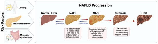 Non-alcoholic fatty liver disease (NAFLD) is one of the most common chronic liver conditions worldwide, encompassing a spectrum of conditions characterized by varying degrees of hepatic steatosis and cellular injury [,]. It develops in the absence of secondary causes such as significant alcohol consumption, steatogenic medications, or other hepatic diseases [,]. NAFLD progresses in severity from simple steatosis, known as non-alcoholic fatty liver (NAFL), to non-alcoholic steatohepatitis (NASH), and ultimately to hepatic cirrhosis. This progression is driven by hepatocellular inflammation, damage, and subsequent fibrosis (Figure 1) []. Severe complications of this ongoing liver damage include hepatocellular carcinoma (HCC) and liver failure, often necessitating liver transplantation (LT) [].