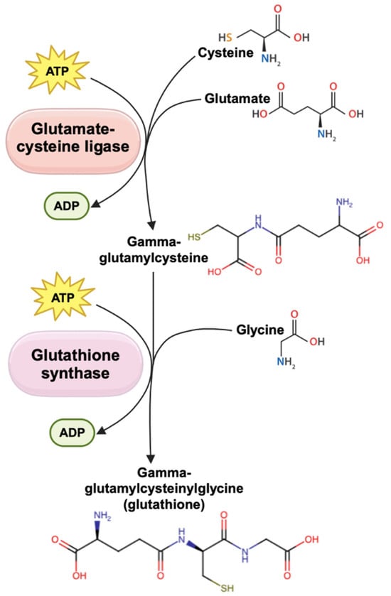 In a process called the γ-glutamyl cycle, GSH is continuously recycled to ensure a steady-state supply in cells. The process begins with the extracellular breakdown of GSH into its constituent amino acids—glutamate and cysteine—by hepatic γ-glutamyl transferase (GGT), an enzyme present only on the external surfaces of cell types, such as those of the hepatobiliary tree and heart [,]. These amino acids are then transported into the cell for the next step []. Between these amino acids, cysteine availability is the rate-limiting factor in GSH biosynthesis [,]. Extracellular cysteine is relatively unstable and readily autoxidizes to cystine, which can lead to the production of toxic oxygen free radicals [,,]. Due to its instability, the cystine/glutamate antiporter (xCT) plays a pivotal role in cystine uptake [,,]. The xCT exchanges intracellular glutamate for extracellular cystine, which is reduced to cysteine in the cytosol and ready for GSH synthesis [,,,,]. Additionally, in a separate metabolic pathway known as the transsulfuration (cystathionine) pathway, methionine can be metabolized in the liver to provide an alternative source of cysteine for GSH production [,,]. GSH can then be synthesized de novo in a two-step ATP-requiring enzymatic process utilizing glutamate cysteine ligase (GCL) and glutathione synthetase (GS) (Figure 2) [,]. GCL catalyzes the formation of γ-glutamylcysteine from glutamate and cysteine, which is then combined with glycine via GS to produce GSH [,]. This process, coupled with GSH utilization and reduction, constitutes the γ-glutamyl cycle, a process that ensures a steady state of GSH in cells [].