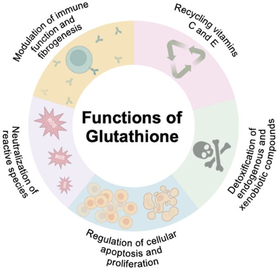 Beyond its antioxidant and detoxifying properties, GSH is essential for maintaining physiological balance. GSH plays a pivotal role in maintaining redox balance, regulating immune responses, and supporting energy production and cellular repair (Figure 3) []. However, under oxidative stress, the depletion of GSH and accumulation of GSSG can compromise these functions, triggering apoptotic pathways and contributing to cell death [,]. This underscores the vital role of GSH in maintaining cellular homeostasis and its potential therapeutic importance in conditions characterized by oxidative damage.