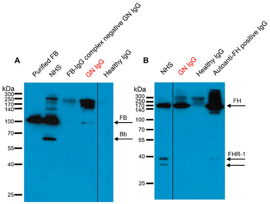 Immune complexes formed in vivo were detected in the IgG fraction of the patient. IgG isolated from the patient (indicated in red) and healthy donors were separated on SDS-PAGE, and the presence of FB (A) and FH (B) was detected in Western blot with polyclonal goat anti-FB (A) and monoclonal mouse anti-FH, also recognizing FHR-1 (B). Purified FB, IgG of a FB-IgG complex negative GN patient, normal human serum (NHS), IgG of healthy donors (A), and IgG of an autoanti-FH positive aHUS patient forming IgG-FH and IgG-FHR-1 complexes (B) were run and are shown as controls. The bands seen above FB (A) and FH (B) are probably due to the cross-reactivity of the secondary antibodies with human IgG. Blots are representative of three experiments. Original blots are presented in Supplementary Figures S4 and S5. FB: factor B, FH: factor H, FHR: factor H-related, aHUS: atypical hemolytic uremic syndrome, GN: glomerulonephritis.