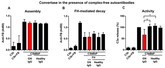 Complex-free autoantibodies reduced the activity of the solid phase C3 convertase (C3bBbP). (A) Patient IgG (GN IgG, shown in red) had no effect on the assembly of the solid phase C3 convertase when added together with the components (FB, FD, and properdin) of the convertase during assembly. Data are mean ± SD from three independent experiments. (B) Complex-free autoantibodies do not affect the FH-mediated decay when added to the convertase together with FH. Data are mean ± SD from three independent experiments. The results of two healthy controls have already been published [40]. (C) Assembled convertase was preincubated with IgG from the patient or healthy donors, then C3 was added and incubated at 37 °C. The generated C3a was measured in the supernatant with a specific C3a ELISA. Autoantibodies of the patient reduced the activity of the convertase. Data were normalized to the values obtained without the addition of IgG. Data are mean ± SD from four independent experiments. One-Way ANOVA, * p = 0.0222.