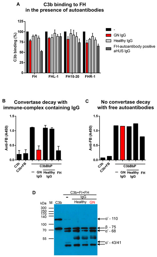 Next, we tested the autoantibodies’ effect in fluid phase cofactor assay when we determined the FI-mediated C3b cleavage in the presence of the complex-free IgG (Figure 4D). C3b was incubated with FI, FH, and IgG, and then the samples were analyzed using SDS-PAGE and Western blot. When FH is present, FI can cleave C3b, resulting in the disappearance of the 110 kDa α′ chain and the appearance of its 68, 43, and 41 kDa fragments (Figure 4D, lane 2). No difference could be seen when the IgG of healthy controls (lanes 3, 4) or the patient (lane 5) was mixed in the reaction, suggesting that the autoantibodies did not impair FH cofactor activity.