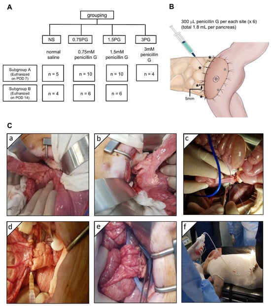 Experimental design and procedure. (A) Study design. (B) Intrapancreatic injection site (*). After pancreaticojejunostomy (PJ), 300 μL (total 1.8 mL) of normal saline (NS), 0.75 mM PG, or 1.5 mM PG was injected at six locations around the circumference of the pancreas located within 1 cm from the PJ site. (C) Operative illustration. After laparotomy, the pancreas was identified and exposed (a). The pancreatic tail was divided at about 3 cm from the back (b), and then end-to-side PJ was performed with the proximal jejunum (c). The animals in the NS, 0.75 PG, and 1.5 PG groups received, respectively, NS, 0.75 mM PG, and 1.5 mM PG to the periphery of the pancreas where PJ was established (d). Both ends of the JP drain tips were placed adjacent to the PJ site, anteriorly and posteriorly, respectively (e). The pig was clothed for the prevention of dislocation and for fixation of the JP drain (f). Abbreviations: 0.75 PG, intrapancreatic injection of 0.75 mM PG; 1.5 PG, intrapancreatic injection of 1.5 mM PG; NS, intrapancreatic injection of 1.8 mL NS.