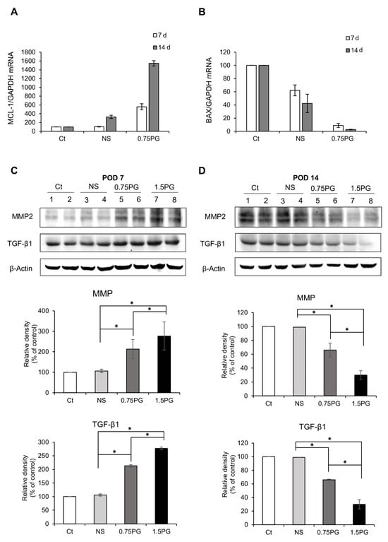 Analysis of apoptosis and fibrosis in the porcine pancreas following intrapancreatic PG injection. Real-time PCR analysis of pro-apoptotic marker BAX (A) and anti-apoptotic marker Mcl-1 (B) expression in pig pancreatic tissues injected with various materials. Comparing the 0.75 PG group to the control and NS groups, a significant decrease in the pro-apoptotic marker BAX expression was observed, along with an increase in the expression of the anti-apoptotic marker Mcl-1. (C) Western blotting analysis on POD 7 showing the expression of the profibrotic markers MMP2 and TGF-β1 in the pancreatic tissues in each group. The 1.5 PG group showed the highest expression of MMP2 and TGF- β1 (p < 0.05). (D) Western blotting analysis on POD 14 showing the expression of the profibrotic markers MMP2 and TGF- β1 in the pancreatic tissues in each group. The expression levels of the fibrotic proteins MMP2 and TGF-β1 proteins—which had been increased on POD 7—were normalized. Values are presented as mean ± standard deviation of three independent experiments. * p < 0.05. Abbreviations: 1.5 PG, intrapancreatic injection of 1.5 mM PG; 0.75 PG, intrapancreatic injection of 0.75 mM PG; Ct, control group; MMP-2, metalloproteinases-2; NS, intrapancreatic injection of 1.8 mL NS; TGF-β1, transforming growth factor-β1.