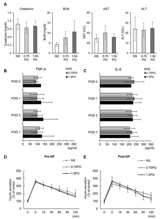 Evaluation of hepatic, renal, systemic inflammatory, and pancreatic endocrine function following intrapancreatic PG injection. (A) kidney function (creatinine, BUN) and liver function (AST, ALT) markers were assessed across experimental groups (NS, 0.75 PG, and 1.5 PG), showing no significant differences between groups. (B) Comparison of serum concentration of TNF-α in each group over time. (C) Comparison of serum concentration of IL-6 in each group over time. (D) Pre-injection comparison of serum levels of insulin at certain time intervals by ELISA after glucose infusion in each group. (E) Post-injection comparison of serum levels of insulin at certain time intervals by ELISA after glucose infusion in each group. Values are presented as mean ± standard deviation of three independent experiments. Abbreviations: 0.75 PG, intrapancreatic injection of 0.75 mM PG; 1.5 PG, intrapancreatic injection of 1.5 mM PG; NS, intrapancreatic injection of 1.8 mL NS; TGF-β1, transforming growth factor-β1.