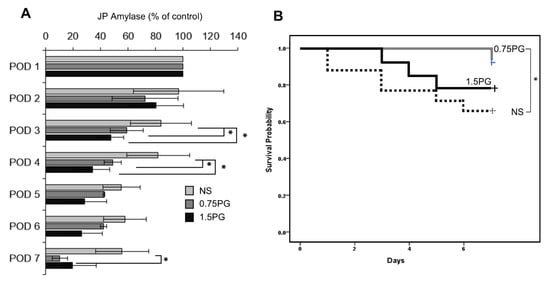 PG effects on the development of POPF and pig survival. (A) Analysis of JP amylase levels in the experimental groups over a seven-day period. On POD 3, JP amylase levels were significantly lower in the 0.75 PG and 1.5 groups than in the NS group (p < 0.05). Interestingly, on POD 7, JP amylase levels were also significantly lower in the 0.75 PG than in the NS group (p < 0.05). Values are presented as mean ± standard deviation of three independent experiments. (B) Kaplan-Meier survival analysis of the 0.75 PG, 1.5 PG, and NS groups. The 0.75 PG group exhibited the highest survival rate, with a significant difference in survival rates observed between the 1.5 PG group and the NS group. * p < 0.05. Abbreviations: 0.75 PG, the group with intrapancreatic injection of 0.75 mM PG; 1.5 PG, the group with 1.5 mM PG; NS, the group with 1.8 mL NS.