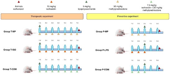 The study comprised two phases: preventive and therapeutic. In all the experiments that involved induction by LPS (Sigma-Aldrich, Darmstadt, Germany, Escherichia coli, serotype 055: B5, lot 0000133605/99%), a single dose of LPS (5 mg/kg) was administered intraperitoneally; all agents, including LPS, were administered intraperitoneally [24,25,26]. The preventive phase involved the administration of the agents before LPS induction; each group contained 10 animals. In the P-MP group, 50 mg/kg of methylprednisolone (Hangzhou Hyper Chem. Limited, Hangzhou, China) was given daily for 3 days before induction. After induction, the animals were left for 2 days without intervention [24,27]. Similar procedures were performed for the P-ISO (15 mg/kg once daily of isofraxidin (Hangzhou Hyper Chem. Limited, Hangzhou, China) for 3 days [28]) and P-COM groups (a combination of 7.5 mg/kg of isofraxidin plus 25 mg/kg methylprednisolone for 3 days [27,28]) before LPS induction. Additionally, two groups, P-C (negative control) and P-I (LPS induction), did not receive any treatment and were followed up after 5 days, as seen in Figure 1.