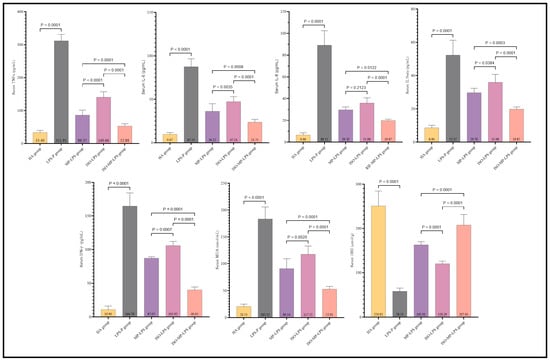 All blood samples were obtained from the jugular vein, and plasma was separated using a centrifuge at 3000 rpm for 10 min; serum was collected in 2 mL Eppendorf tubes and was deposited at −20 °C for subsequent thawing [36]. The quantitative assessment of biomarkers (GSH, IL-1β, IL-8, IFN-γ, IL-6, TNF-α, and MDA) in mouse serum was conducted using enzyme-linked immunosorbent assay (ELISA) kits, following the manufacturer’s instructions (Sunlong, Shanghai, China).