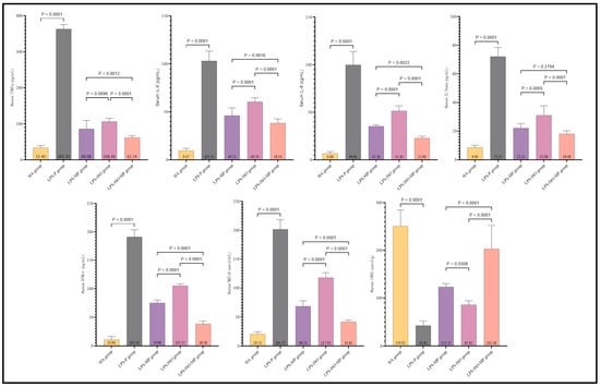 The serum levels of IL-6, TNF-α, IL-1β, IL-8, MDA, and IFN-γ were significantly higher in the induction group compared to the control group, highlighting the severity of CRS. Conversely, GSH levels were notably lower in the induction group. The data presented in Figure 2 are essential for understanding the preventive effects of the medications in the CRS context.