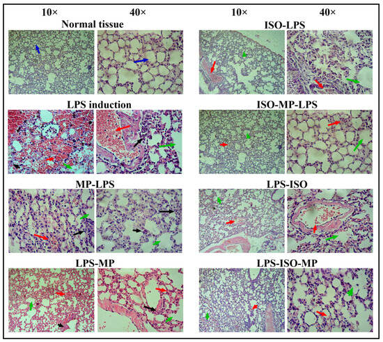 Histopathology of lung tissue showing impacts of different therapies in mice. H&E stain, 10× and 40× power. Blue arrow: normal lung architecture including alveoli; black arrow: severe acute inflammation; red arrow: vascular congestion and capillary destruction; green arrow: thick alveolar walls and narrow air space with hyaline membrane.