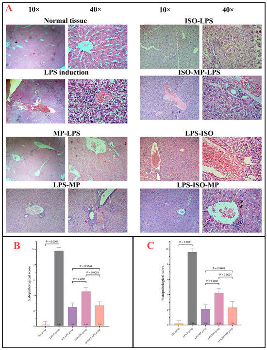 Regarding isofraxidin as a therapeutic agent, the mice treated with the LPS + isofraxidin combination showed vascular congestion and dilation, minor edema, limited mixed inflammatory cell infiltration, and moderate lobular hepatocyte degeneration with mild necrosis. The mice in the LPS + isofraxidin + MP group displayed vascular congestion and dilation with minor edema, slight inflammatory cell infiltration, and early hepatocyte degradation without necrosis, as illustrated in Figure 5A. All groups showed a significant reduction in overall liver scores compared to the induction group and considerably higher liver scores than the control group. Isofraxidin alone resulted in markedly higher liver scores compared to the P-MP group. However, the combination of isofraxidin and MP showed negligible differences compared to the P-MP group, as shown in Figure 5C.