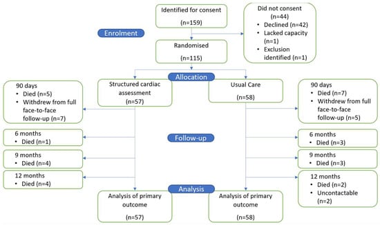 A total of 159 patients were identified as suitable for enrolment by their clinical team between 17 December 2020 and 30 May 2022. Recruitment was slower than anticipated due to the COVID-19 pandemic. A total of 115 patients were both eligible and provided consent; 57 patients were allocated to the SCA arm and 58 to UC (Figure 1). Trial recruitment was ceased in May 2022 after recommendation from the Trial Management Group that sufficient numbers had been recruited to meet trial objectives.