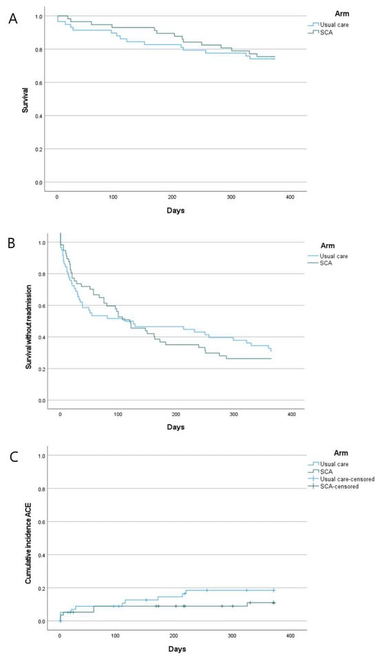 Kaplan–Meier plots. (A): Mortality; (B): survival without readmission; (C): incidence of major adverse cardiovascular events (ACEs). Censored patients in (C) are those who dropped out of follow-up for reasons other than experiencing an ACE.
