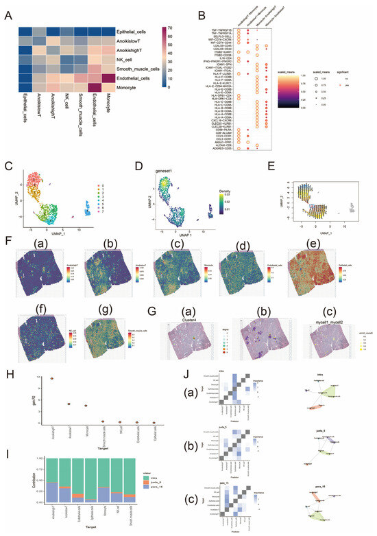 Single-cell and spatial transcriptome analyses of the Anoikis gene set in prostate cancer. (A) demonstrates the strength of cellular communication between the seven cell types. Colors from blue to red indicate a gradual increase in intensity. (B) demonstrates ligand–receptor interactions between AnoikishighT and monocytes. Darker to lighter colors and smaller to larger circles indicate a gradual increase in the strength of the interaction; circles with a border indicate a significant interaction and vice versa. (C) shows the UMAP downscaled images of the eight cell clusters. (D) shows the downscaled density map of the Anoikis gene set in T cells. The color from blue to yellow indicates a gradual increase in density. (E) illustrates the reverse chronological analysis of the Anoikis gene set in T cells. The position of the box represents the developmental starting point, and the arrow points to the developmental end point. In (F), (a)–(g) are the spatial expression characteristics of AnoikishighT, AnoikislowT, monocytes, endothelial cells, epithelial cells, NK cells, and smooth muscle cells, respectively. The homotypic cell network of AnoikishighT is shown in (G) (a). The degree from 0 to 6 indicates that the central cell is surrounded by a gradually increasing number of cells of the same type. (G) (b) shows the interactions region of the heterotypic cell network. (G) (c) is an enrichment scoring image of the interaction between AnoikishighT and monocytes. Darker colors represent stronger interactions. (H) demonstrates the degree of influence of spatial environment on different cell types (R2 benefit). (I) represents the proportion of predicted contribution of different spatial scales to cell types. Green indicates a spatial scale with radius 0; yellow indicates a spatial scale with radius 5; and blue indicates a spatial scale with radius 15. (J) demonstrates the co-expression analysis between cell subpopulations at different spatial scales. (a)–(c) show the analysis of different cell subpopulations at spatial scales of 0, 5, and 15, respectively. The figures shown in the left column are interaction heatmaps of cells at different spatial scales. The color gradient represents the strength of these interactions, with darker colors indicating stronger inter-actions. The images in the right column are community plots at different spatial scales. Each community represents a group of cells that are tightly distributed in space, and these cells may share functional similarities or collaborate in biological processes.
