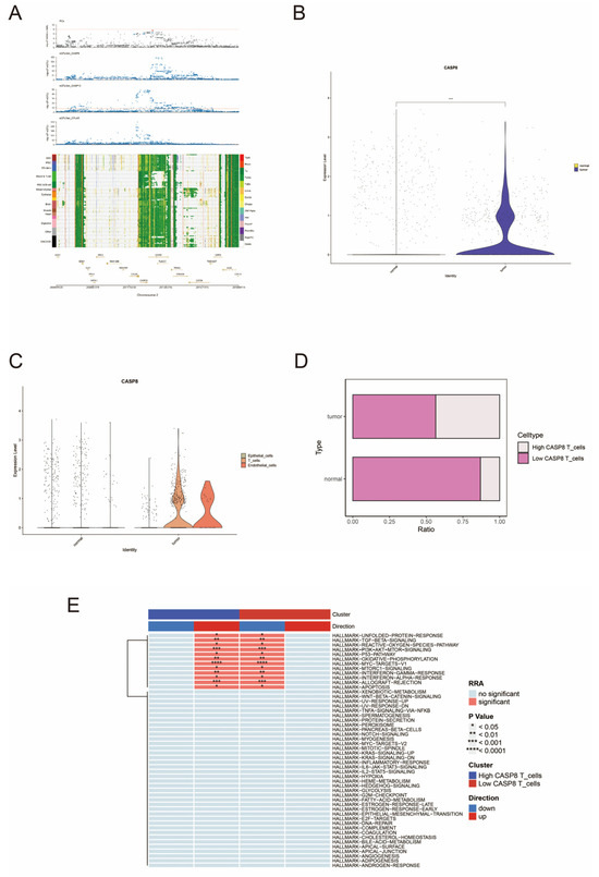 SMR analysis and single-cell analysis of CASP8 in the prostate. (A) is a gene–trait association loci map from SMR analysis: images of association loci with prostate cancer for all genes within the same locus as CASP8. (B) shows the difference in expression levels of CASP8 in tumor and normal tissues. Blue indicates tumor tissue and yellow indicates normal tissue. **** p < 0.0001. (C) demonstrates the expression difference of CASP8 in different cells of tumor and normal tissues. Green represents epithelial cells; yellow represents T cells; orange represents endothelial cells. (D) shows the ratio of high and low CASP8 expression in T cells within tumors and normal tissues. White indicates high CASP8 expression, and pink indicates low CASP8 expression. (E) demonstrates the HALLMARK pathway enrichment differences between high- and low-CASP8-expression groups in T cells. Blue in Cluster indicates the high expression of CASP8; red indicates the low expression of CASP8. Blue in Direction indicates downregulation and red indicates upregulation. * p < 0.05; ** p < 0.01; *** p < 0.001; **** p < 0.0001. No color in RRA indicates nonsignificant results; red indicates significant results.