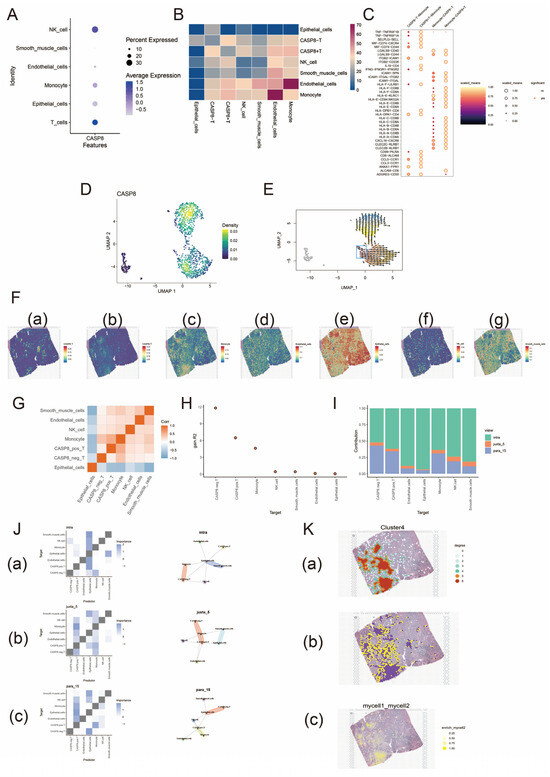 Single-cell and spatial transcriptome analysis of CASP8 in prostate cancer. (A) shows the expression levels of CASP8 in different cell types. The size of the circle represents the size of the expression ratio; the darker the blue color, the higher the expression level. (B) shows the intensity of cellular communication between the seven cell types. The blue to red color indicates a gradual increase in intensity. (C) shows the ligand–receptor interaction between CASP8+T and monocytes. Darker to lighter colors and smaller to larger circles indicate a gradual increase in the strength of the interaction; a bordered circle indicates a significant interaction and vice versa. (D) shows a downscaled density plot of CASP8 in T cells. The blue to yellow color indicates a gradual increase in density. (E) shows the reverse chronological analysis of CASP8 in T cells. The position of the box represents the developmental starting point and the arrow points to the developmental end point. The spatial expression characteristics of CASP8-T, CASP8+T, monocytes, endothelial cells, epithelial cells, NK cells, and smooth muscle cells are shown in (F) (a)–(g), respectively. The transition from blue to red indicates a gradual increase in the expression of the cell type in that spatial region. (G) shows the correlation analysis between different cell types. Blue color indicates low correlation and orange color indicates high correlation. (H) shows the degree of influence of spatial environment on different cell types (R2 benefit). (I) indicates the proportion of predicted contribution of different spatial scales to cell types. Green indicates a spatial scale of radius 0; yellow indicates a spatial scale of radius 5; and blue indicates a spatial scale of radius 15. (J) shows the co-expression analysis between cell subpopulations at different spatial scales. (a)–(c) show the analysis of different cell subpopulations at spatial scales of 0, 5, and 15, respectively. The figures shown in the left column are interaction heatmaps of cells at different spatial scales. The color gradient represents the strength of these interactions, with darker colors indicating stronger inter-actions. The images in the right column are community plots at different spatial scales. Each community represents a group of cells that are tightly distributed in space, and these cells may share functional similarities or collaborate in biological processes. (K) (a) shows the homotypic cell network of CASP8+T cells. From 0 to 6 indicates that the central cell is surrounded by progressively more homotypic cells. (K) (b) shows the interaction region of the heterotypic cell network between CASP8+T cells and monocytes. (K) (c) is an image of the enrichment score of CASP8+T cells interacting with monocytes. Darker colors represent stronger interactions.