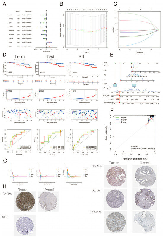We downloaded to obtain the gene expression matrix of the GSE116918 dataset and constructed the BCR prognostic model of prostate cancer based on the differential genes between CASP8+T and CASP8-T cells. The dataset was first randomly divided into training and test sets according to a 1:1 ratio, and then the training set was trained. One-way Cox regression screened nine genes associated with prognosis (p < 0.05), and then lasso–Cox regression was applied to combine lasso regression with Cox proportional risk regression to screen key variables predicting survival outcomes, and multifactorial Cox regression was used to further confirm whether the associations of the variables with survival were independent (Figure 4A–C). Eventually, four genes were screened as the core genes for constructing the BCR prognostic model for prostate cancer. The risk score formula was as follows: riskscore = 0.82 × TXNIP + 1.57 × XCL1 − 1.09 × KLF6 − 1.76 × SAMSN1. The prognostic model was able to differentiate between high-risk and low-risk groups well for the training set, the test set, and the entire dataset (Figure 4D). Time-dependent ROC analysis proved the model’s discriminatory ability throughout the entire dataset: the 5-year AUC for the full sample was 0.713. To further improve the predictive performance of the model, we combined the risk score and clinical parameters to construct a nomogram to predict the incidence of BCR at 3, 4, and 5 years after therapy for prostate cancer, and the results showed that the C-index was 0.683, with a certain degree of accuracy, and risk scores were independently associated with BCR (Figure 4E); and the calibration curves suggested a good predictive accuracy (Figure 4F). Decision curve analysis (DCA) was performed to calculate the clinical indicators, risk scores, and the net clinical benefit of the nomogram (Figure 4G). Immunohistochemical results suggested that in tumor tissues, CASP8 and SAMSN1 showed high staining, TXNIP showed medium staining, while KLF6 and XCL1 showed negative staining; in normal tissues, KLF6 showed medium staining, CASP8 and SAMSN1 showed low staining, while TXNIP showed negative staining (Figure 4H).
