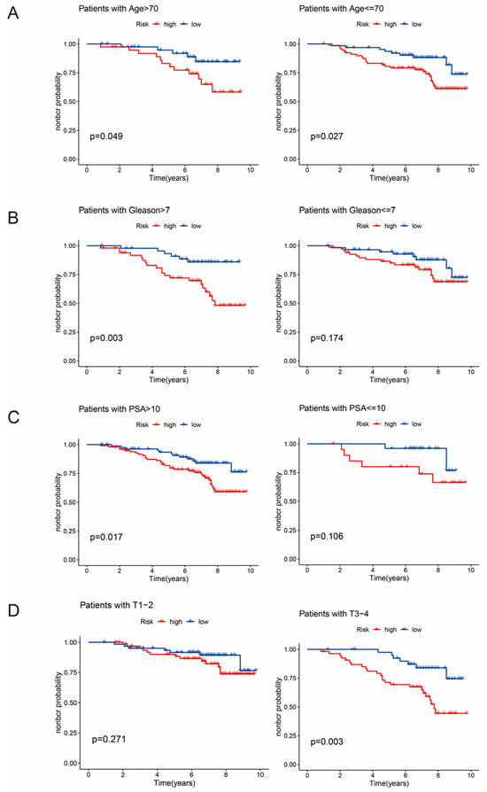 Clinical subgroup analysis of prognostic models. (A) shows a comparison of survival analyses between age ≤ 70 and age > 70. (B) shows a comparison of survival analysis between Gleason ≤ 7 and Gleason > 7. (C) shows the comparison of survival analysis between PSA ≤ 10 and PSA > 10. (D) shows the comparison of survival analysis between stages T1–2 and T3–4.