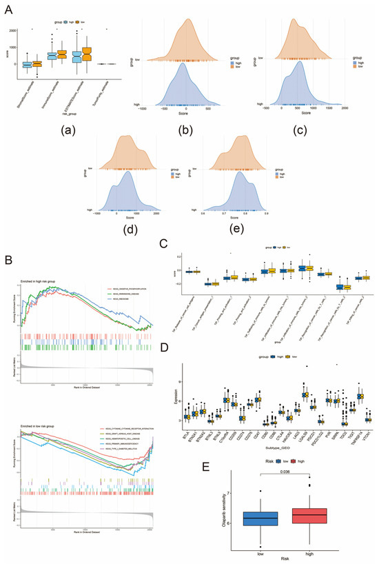 Tumor microenvironment, GSEA, tumor–immune circulation, immune checkpoints, and drug sensitivity analysis between high- and low-risk groups. (A) shows the tumor microenvironment analysis between high- and low-risk groups. (a) is the analysis of the difference in stromal score, immune score, ESTIMATE score, and tumor purity between the high- and low-risk groups. (b)–(e) are peak plots of stromal score, immune score, ESTIMATE score, and tumor purity between high- and low-risk groups, respectively. (B) shows the GSEA analysis of the high- and low-risk groups. A convex upward curve indicates upregulation of the pathway and a convex downward curve indicates downregulation of the pathway. (C) is the tumor–immune circulation analysis of the high- and low-risk groups. * indicates that key steps in the cycle differ in the high- and low-risk groups. Blue color indicates high-risk group and yellow color indicates low risk. (D) is an immune checkpoint analysis of the high- and low-risk groups. * indicates that checkpoints are significantly different between high- and low-risk groups. Blue color indicates high-risk group and yellow color indicates low-risk group. (E) shows the drug sensitivity analysis between the high- and low-risk groups. Blue color indicates low-risk group and red color indicates high-risk group.