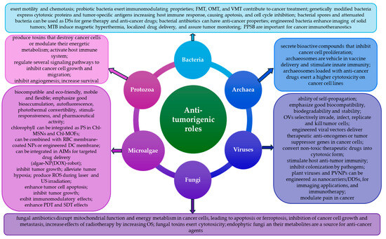 Numerous species of protozoa as well as protozoan-derived molecules may have pro-tumorigenic or anti-neoplastic potential, so these parasites emphasize great interest in cancer therapy, resulting in pathogen-based cancer therapies. Parasites induce modification in the cell cycle, metabolism, glycosylation, DNA mutations, apoptosis, cell senescence, metastatic cascade, and angiogenesis, but on the other side, the host immune system becomes activated and enhanced by protozoa parasites and their derived products, thereby inhibiting tumor growth, angiogenesis, and metastasis. The discovery of numerous species of protozoa and their components with anti-tumor potential introduced a novel direction for the development of protozoa-based anti-cancer treatment that necessitates further extensive studies [15]. Microalgae-inspired microrobots are also recommended to fight against cancer due to their biocompatibility, autofluorescence, photothermal convertibility, stimuli-responsiveness, generation of photodynamical radicals, and pharmaceutical activity. Fortunately, there is no limit to the development of novel approaches in cancer biomedicine. This review summarized the most important pro-cancer (Figure 1) as well as anti-cancer (Figure 2) roles of viruses, bacteria, archaea, fungi, protozoa, and microalgae.