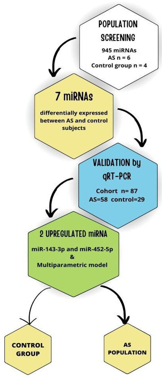 In conclusion, among older patients with severe AS, we identified two differentially expressed miRNAs, one of which (miR-452-5p) has not been previously described in this population. These findings may open new avenues for research into the molecular pathogenesis of AS. Our multiparametric model that combines biohumeral and functional evaluations could improve the accuracy of AS diagnosis and risk stratification.