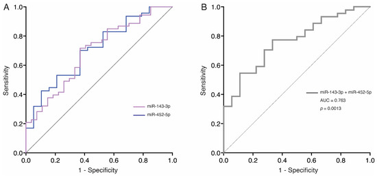 We assessed the ability of the differentially expressed miRNAs to discriminate between patients with AS and healthy controls via the AUC. As shown in Figure 4A, both miR-143-3p and miR-452-5p displayed moderate performance, with AUC values of 0.690 (95% CI: 0.569–0.812; p = 0.006) and 0.707 (95% CI: 0.572–0.842; p = 0.009), respectively. The optimal cutoff points for each miRNA were determined to assess their diagnostic accuracy: For miR-143-3p, the cutoff of >0.3965 yielded a sensitivity of 85.2% and a specificity of 98.1%. For miR-452-5p, the cutoff of >0.4165 showed a sensitivity of 85.2% and a specificity of 96.2%. Then, we considered the diagnostic potential of the two-miRNA signature to distinguish between patients with AS and healthy individuals. The AUC for the combination of miR-143-3p and miR-452-5p was 0.763 (95% CI: 0.640–0887; p = 0.001), indicating improved discriminatory power (Figure 4B). The sensitivity, specificity, and accuracy of each miRNA and the two-miRNA signature are shown in Table 2.