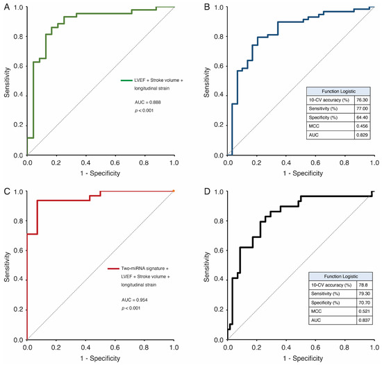 ROC curves for evaluating the predictive performance of clinical factors with differentially expressed miRNAs. (A) ROC curve of the clinical-only model (GLS + LVEF + LV-SV). (B) ROC curve of the 10-fold cross-validation test for the clinical-only model. (C) ROC curve of the combined value of the 2-miRNA panel +LVEF + LV-SV + GLS model. (D) ROC curve of the 10-fold cross-validation test for the 2-miRNA panel + GLS + LVEF + LV-SV model (function logistic). GLS, global longitudinal strain; LVEF, left ventricular ejection fraction; LV-SV, left ventricular stroke volume; MCC, Matthews correlation coefficient.