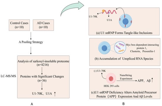 (A) Proteomic comparison reveals that U1-70K and U1A are enriched in the sarkosyl-insoluble proteome of AD patients. They designed a pooling strategy with replicates to simplify the analysis of protein aggregates in the cortical tissues harvested from 10 AD patients and 10 age-matched, nondemented patients (B) (a) The pathological examination revealed significant and widespread extranuclear aggregation of U1snRNP components in the neuronal cells of AD patients; (b) Researchers revealed widespread changes in RNA processing in the brains of AD patients, including the accumulation of unspliced RNA species, by comparing RNA in the brains of AD and control groups; (c) Through the knockdown of U7-70K, researchers found an increase in levels of amyloid precursor protein, which indicates that the abnormalities in U1snRNP may be associated with the pathological process of AD.